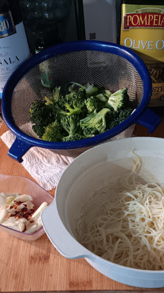 . . .smash a few cloves of garlic (I’m a garlic lover, but you can use as many or as little as you like); add about 1/4 tsp of crushed red pepper flakes (more or less), rinse, dry & slice your Broccoli Florets (slice them very thin), then pour about 1/3 of a cup of good Olive Oil into a non-stick frying pan (I like to use stainless steel here, cast iron will also work well). Add the crushed garlic and red pepper flakes and a few *Anchovy fillets to the pan and heat over medium heat *(I love anchovies but you can leave them out of you don’t like them). Heat this mixture, stirring regularly, until the garlic turns golden brown – smashing up the anchovies with the back of a wooden spoon as you do so. As soon as it turns brown remove the garlic from the pan and set it aside.