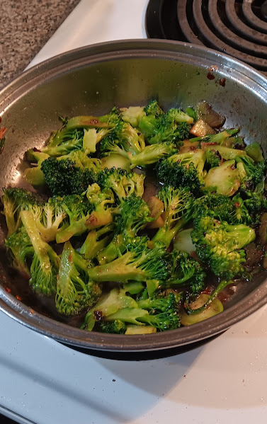 Now add the broccoli florets to the hot oil. Add salt and coarsely ground black pepper (go easy on the salt of you used anchovies). Toss to coat the broccoli with the oil mixture. Continue to heat over medium heat until the broccoli reaches the texture you want (I like mine to remain nice and “crunchy” – it may only take 4 or 5 minutes). Then turn the heat to “high” and pour in a big splash of Sweet Marsala Wine – about 1/4 cup (if you don’t like wine you can use a vinegar (red, white wine, white Balsamic (that would be good, too) and stir with your wooden spoon to deglaze.