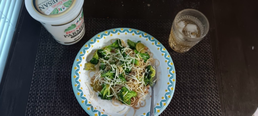 Once the broccoli has been cooked to your liking, add in the pasta. If necessary (if the mixture looks too dry) you can add a little water or pasta water to the pan (i added a big serving of leftover cooked Angel Hair Pasta). Toss to coat one more time, then top with shredded Parmesan (I used Parmesan this time, but Palmisano Reggiano would be even better!)